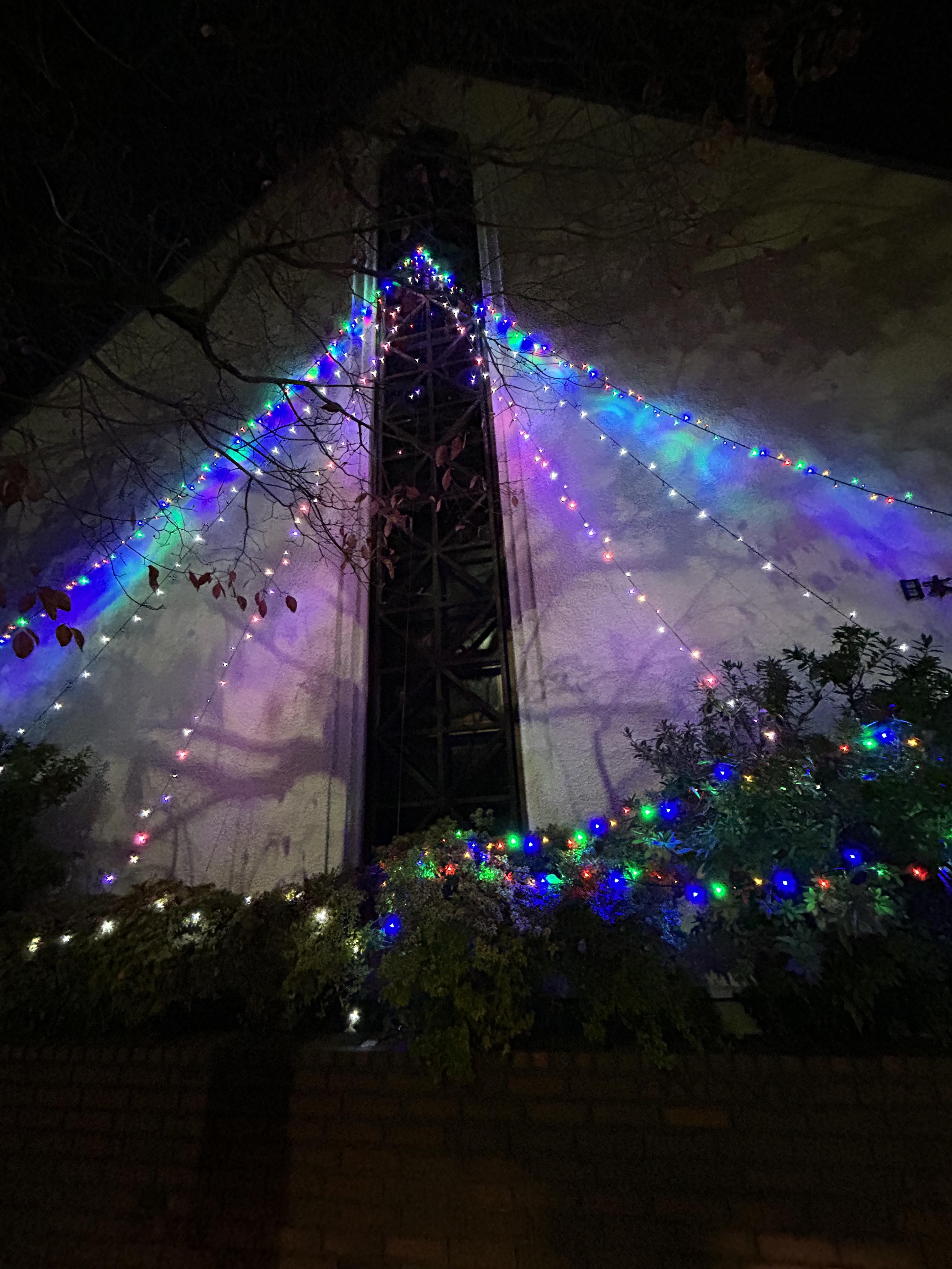 冬には,クリスマスツリーを通りに面した教会壁に取り付けそして取り外しています.